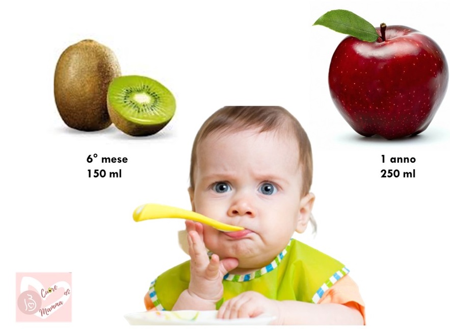 All’età di sei mesi, che coincide pressappoco con l’inizio dello svezzamento, lo stomaco dei bambini e grande circa quanto un kiwi con una capienza di 150ml, crescendo di mese in mese, arriva al 12° mese grande quanto una mela con capienza di 250ml.