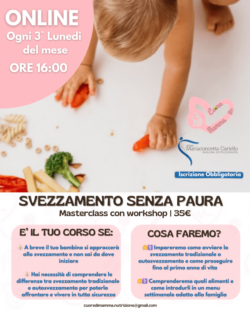 Potrei continuare all’infinito con le domande, le paure e la ricerca di una soluzione, ma ogni cosa va contestualizzata all’età, alla tipologia di alimentazione condotta e all’educazione in famiglia, a tale scopo infatti il servizio “Cuore di mamma” prevede proprio di insegnare ad ogni genitore in questa tappa come elaborare un menu settimanale adatto per tutta la famiglia.